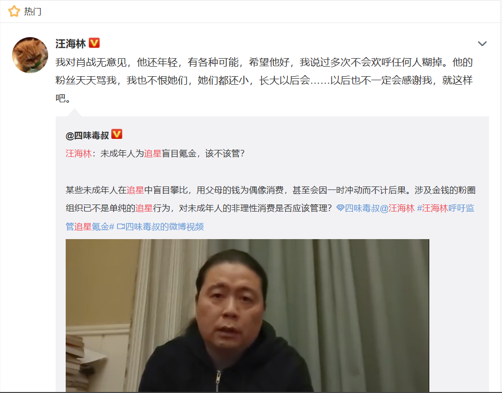 汪海林自己也承认,真正反对的不是某个特定的流量明星,而是这个群体文化所带来的娱乐生态失衡,需要社会进行积极引导。
