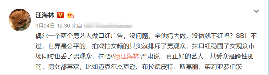 近日编剧汪海林,舌战的焦点成了代言口红的男明星们,在微博上汪海林批评他们以拍口红广告来证明自己当红,而在对一些网友的评论进行回复时,其言语也非常犀利,明确表达了对男星代言口红这一现象的不满。