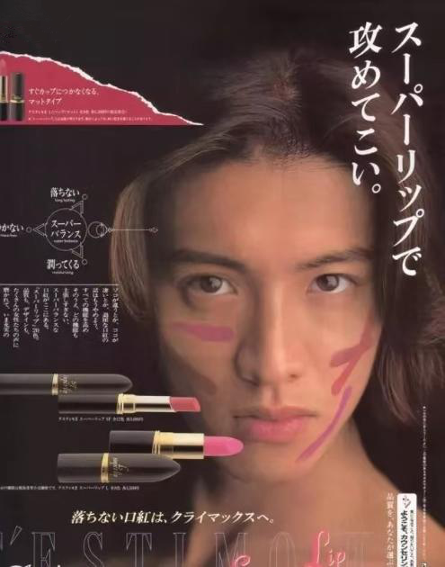 男明星代言美妆的案例其实早已有之。1996年,亚洲红极一时的巨星木村拓哉便代言了某品牌口红,广告片中超级偶像不仅贡献了自己极富诱惑力的中性美感,也成为第一个为口红代言的男明星,在当时轰动了整个广告界。