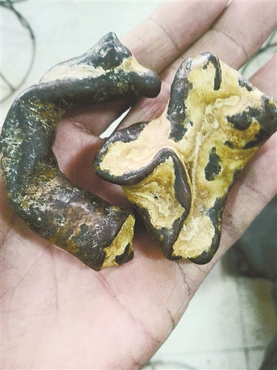 侯先生说,他们家好几代人都从事杀羊的工作,他从小就跟着父亲学杀羊,听父亲说过“牛宝”是好东西,但不知道羊肚子里也会有羊宝。上周的一天,他宰杀一头养了六七年的母羊时,在羊胃里掏出两块硬硬的东西,感觉非常奇怪。后来用水一冲,发现是两块黑黄相间的“石头”,一块是扁的,一块是长的,弯曲成C形,长约三四厘米。
