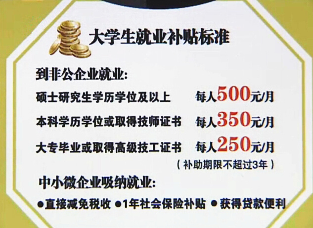 此外,根据《实施意见》,吸纳高校毕业生就业的中小微企业达到相关标准要求的,除了能享受直接减免税收、获得贷款便利外,还能给予1年的社会保险补贴。