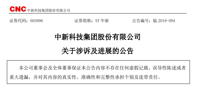 11月19日,根据《中新科技集团股份有限公司关于涉诉及进展的公告》,中新科技集团股份有限公司(以下简称“中新科技”)及全资子公司中新国际电子有限公司(以下简称“中新国际电子”)于2019年11月18日及近日收到浙江省台州市椒江区人民法院(以下简称“椒江区法院”)、深圳市宝安区人民法院送达的传票、民事起诉状等文件,本次涉及新增诉讼案件8起,累计新增涉及诉讼金额达到信息披露标准。