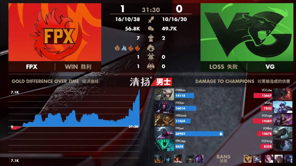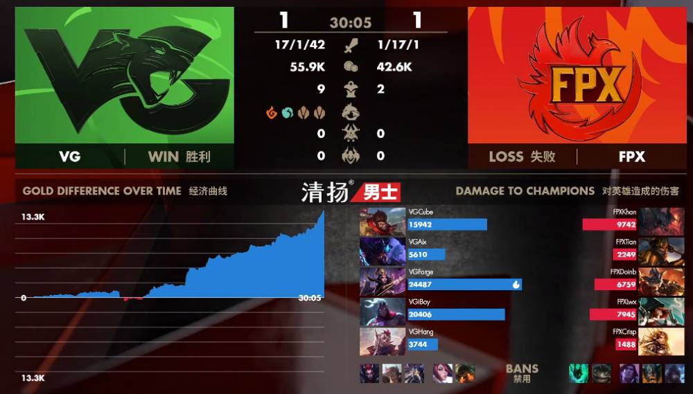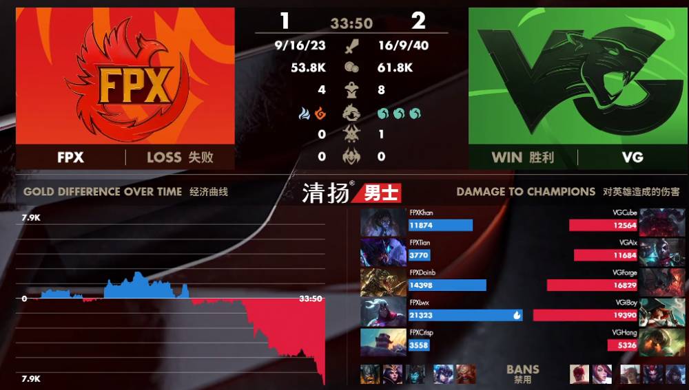 【16:40】在先锋处妖姬一套打残兰博,兰博被迫回家后VG直接动手峡谷先锋,猴子进场开团击杀FPX四人后拿下先锋;