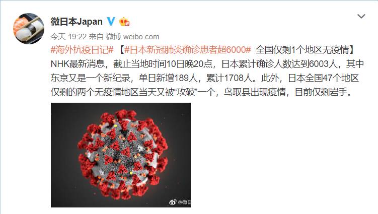 日本新冠肺炎确诊患者超6000 仅剩1个地区无疫情2020-04-10 20:28:43 微博4月10日讯NHK最新消息,截至当地时间10日晚20点,日