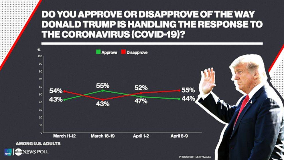 4月10日讯ABC新闻最新民调显示,55%的参与调查者不认可特朗普应对新冠疫情的方式,44%的民众则对总统抗疫手段表示认同。