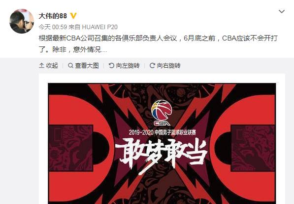 4月11日讯 据《青岛晚报》记者王大伟报道,根据最新CBA公司召集的各俱乐部负责人会议,6月底之前,CBA应该不会开打了,除非有意外情况。