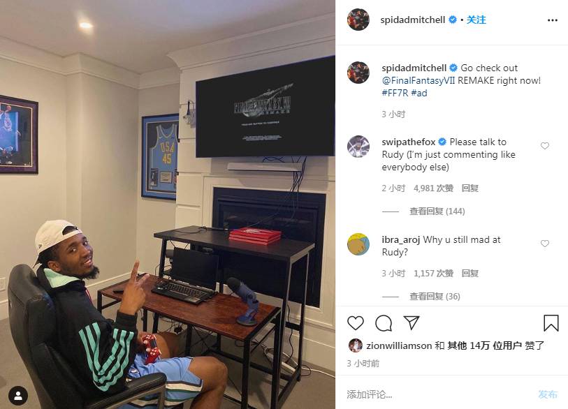 米切尔也打《最终幻想7》 福克斯评论:请和戈贝尔聊聊2020-04-11 10:01:40 Instagram4月11日讯 米切尔今天更新了ins,发布了自己