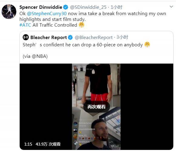 “好的,@斯蒂芬-库里,现在我得暂时停止欣赏我的集锦,开始研究录像了。”丁威迪写道。