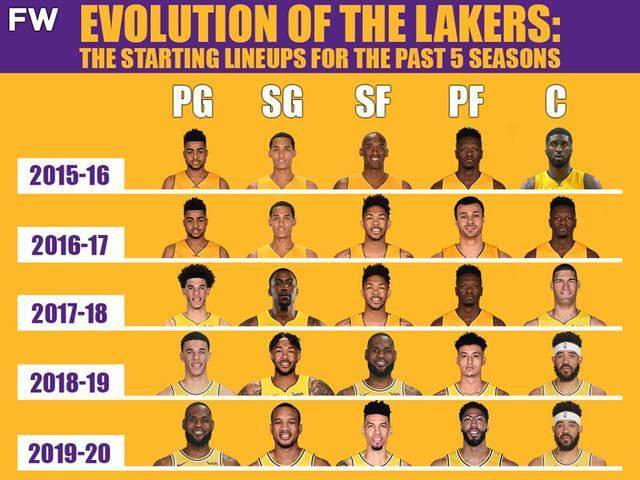4月11日讯 日前有美媒盘点了湖人过去5个赛季主要轮换首发阵容的变化图,一起来看看吧: