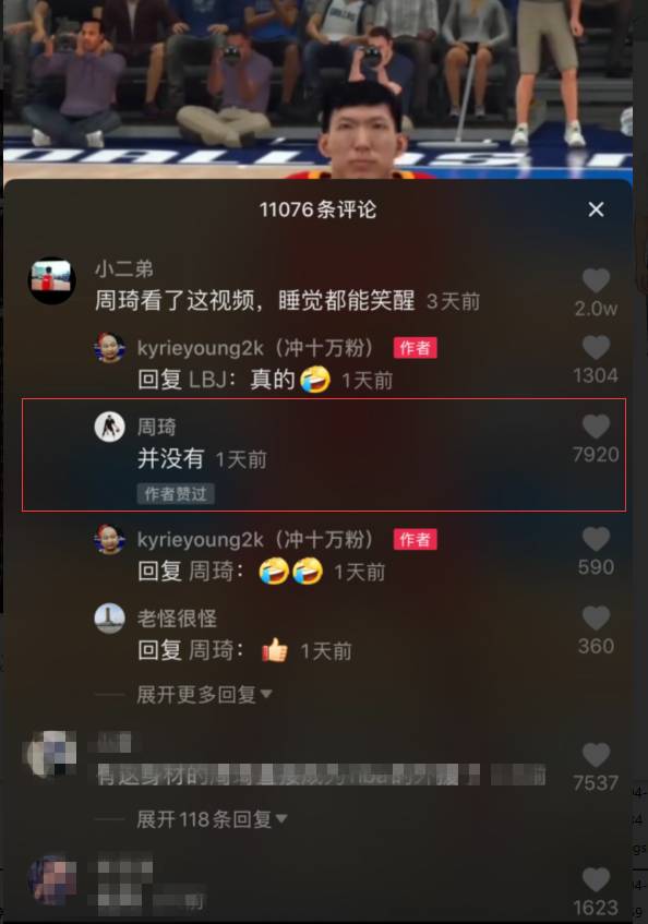 还有网友写道:“周琦看了这视频,睡觉都能笑醒。” 这条评论还获得了周琦的回复,他写道:“并没有。”