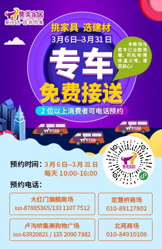 为方便消费者出行,3月6日-3月31日,集美家居开通2人以上(含2人)可享购物专车免费接送服务,包括大红门旗舰商场、卢沟桥集美购物广场、定慧桥商场、北苑商场在内的四家商场同时启动。集美家居表示,商场和专车均已全面消毒,司机师傅体温正常,通过拨打以下各商场专车预约电话即可预约。