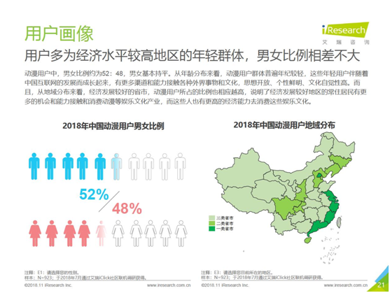 根据艾瑞咨询《2018年中国动漫行业报告》,当前中国动漫用户男女比例基本持平,普遍年纪较轻,这些年轻用户伴随着中国互联网的发展成长期,有更多渠道和能力接触各种外界事物和文化,因此思想开放,文化自觉性高,对于内容的品质要求也更高。
