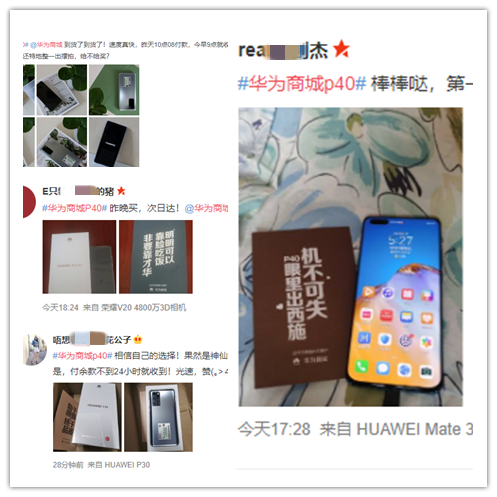P40系列再次刷新移动影像标准,征服大批用户,不少花粉朋友收到在华为商城购买的P40系列新机的第一时间也在微博上纷纷晒图,着实让人羡慕。有网友反馈“昨晚买,次日达”,“昨天22:08付款,今早9点就收到了”纷纷称赞华为商城发货及时、物流配送快。还有网友晒出随包装盒内送到的华为商城首销纪念定制卡,“颜值不是问题,拍照选我就行”、“爱要说出来,喜欢就要买”,开心的用户被华为商城圈粉欢乐不已。