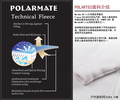 Polartec在抓绒里跟GTX在冲锋衣的地位差不多,是美国MaldenMills公司推出的纺织品材料。迄今为止是户外市场上最受欢迎的抓绒产品。Polartec比一般的抓绒衫轻,软,暖和,而且不掉绒。它干的也比较快,而且伸缩性也不错。
