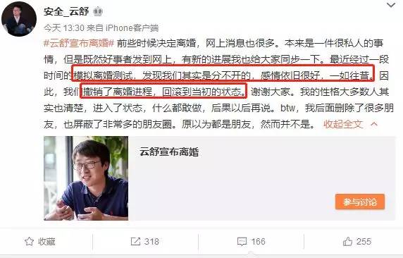 就在大家众说纷纭的时候,3月6日下午,大神微博又了新动态。称“经过一段时间的模拟离婚测试,发现其实分不开……撤销了离婚进程”云云……