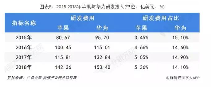苹果虽然具有较高的营业收入、获得的利润也是华为的几倍,而在研发投入力度却不如华为。近年来,华为研发投入逐年增加,维持在营业收入的14%-15%,而苹果的研发投入相对较少,这一比例保持在3%-5%,2018年华为研发投入达153.4亿美元,占营业收入的14.10%,苹果研发费用为142.36万元,占总收入的5.36%。可以看出,华为正研发投入力度相对较高,正努力降低成本、推陈出新,提高公司的营业收入和净利润。