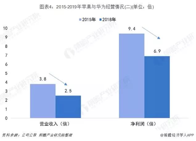 近年来,华为与苹果的营业收入差距逐渐缩小,2015年苹果营业收入约为华为的3.8倍,到2018年,缩小到2.5倍,净利润也由9.4倍缩小至6.9倍,预计未来华为与苹果的获利能力差距将进一步缩小。