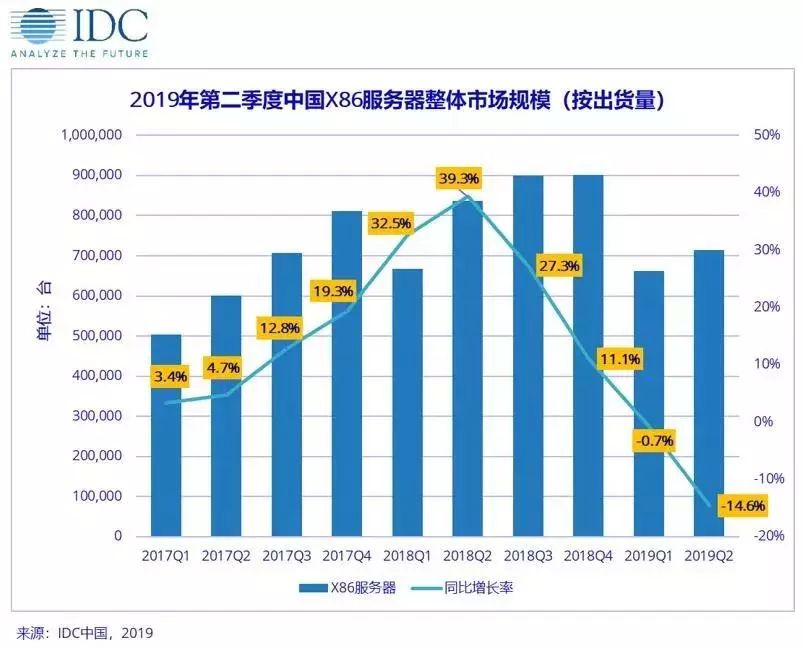 在此前IDC公布的《2019年第二季度全球x86服务器市场调查数据》中可以看到,从全球来看,x86服务器出货量265.5万台,同比下降9.8%,销售额184.0亿美元,同比下降10.6%,相比去年同期以及上一季度,全球服务器市场萎缩也非常明显。
