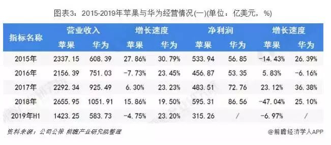 2015-2018年,苹果营业收入相对较高,营收增速波动变化,净利润较高,2018年,苹果营业收入达2655.65亿美元,较2017年增长15.86%。2019年上半年,苹果营业收入较2018年同期有所下滑,为1423.25亿美元;2015-2018年,华为营收增速逐渐减缓,净利润增速波动变化,2018年,华为营业收入为1051.91亿美元,净利润达86.56亿美元。