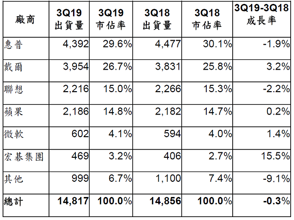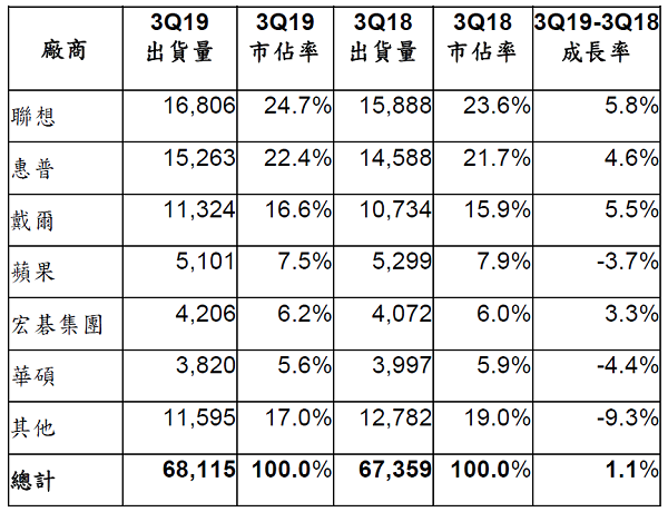 过去几季,PC领导厂商受惠于价格下滑的DRAM及SSD等零组件,在PC业务的毛利已有所改善,前三大厂商联想、惠普(HP)和戴尔(Dell)已然稳固的市场地位因此更为强化。2019年第三季,联想、惠普、戴尔和位居第五的宏碁集团之PC出货量,均较前一年同期有所提升,如下表。