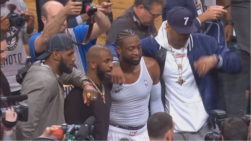 韦德的“香蕉船兄弟”——詹姆斯、保罗、安东尼都来到布鲁克林的现场陪伴韦德跳完这“最后一舞”。