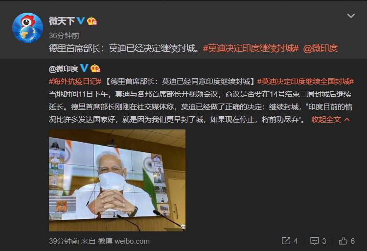 德里首席部长:莫迪已经同意印度继续封城2020-04-11 19:02:07 微博4月11日讯当地时间11日下午,印度总理莫迪与各邦首席部长开视