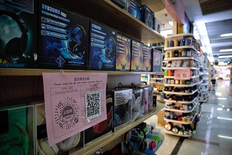 义乌国际商贸城内,每家商铺都贴有疫情防控二维码,客商进店需先扫码,一旦发现疑似病例,可以定位出密切接触者。
