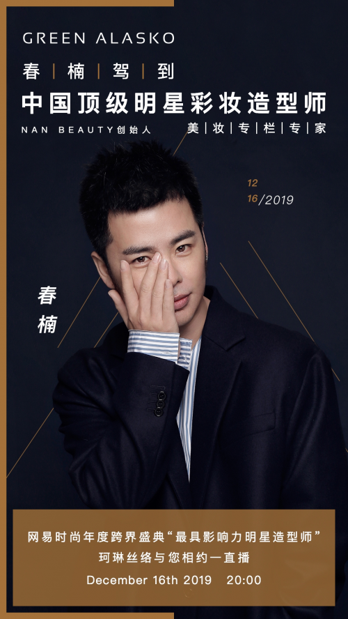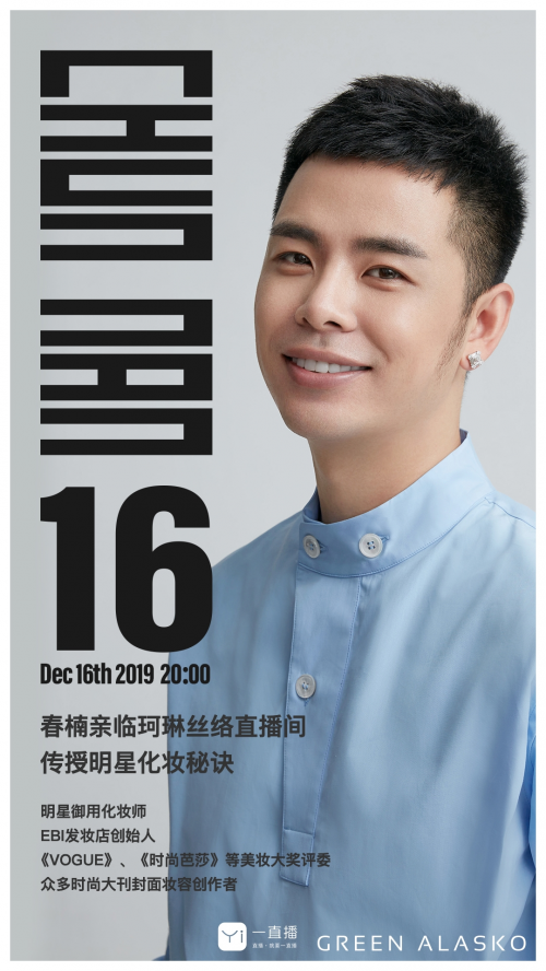 2019年12月16日20:00,锁定【珂琳丝络·一直播】,即刻抱走顶级彩妆造型师春楠老师亲授的课程,独享明星美妆秘籍,变生活的女主,开启你的自信人生!