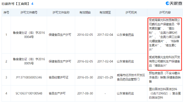 其中,除了“长白源维生素C蜂胶粉胶囊”,上述所列举的剩余5款产品生产企业都是威海紫光金奥力生物技术有限公司(“威海紫光金奥力公司”)。天眼查显示,威海紫光金奥力公司曾于2016年2月份获得2个保健食品生产许可,不过上述产品并不在该企业的保健食品许可内容中。