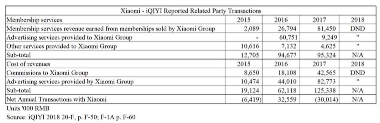 据报道,截至2017年底,小米已成为关联方,爱奇艺-Xiaomi交易的详细信息已在爱奇艺的招股说明书中列出。尽管小米继续将爱奇艺披露为关联方,但爱奇艺却没有这样做。下表摘自爱奇艺的2018 20-F,显示了这些历史交易: