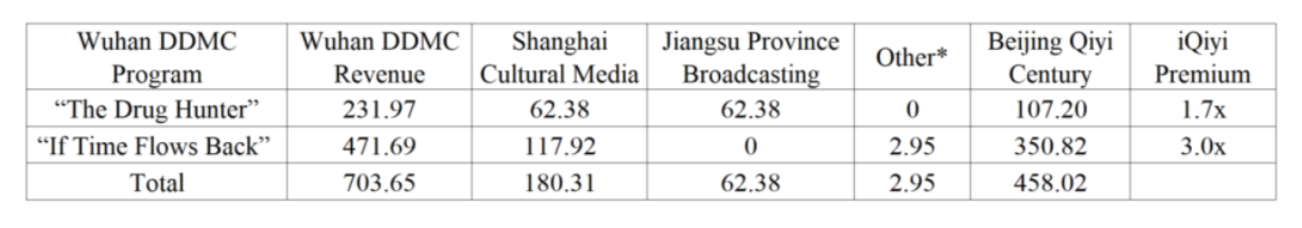 爱奇艺为《毒猎人》支付的价格似乎也高于市场价格。当两个或多个电视台一起播放一个节目时,它们通常会支付相同的费率。将此成本分摊公式应用于当代明诚的这两个节目的总收入以及每个客户的报告收入,我们发现爱奇艺为这两个节目支付了巨额溢价。如果上海文化传媒和江苏省广播电视台都为《毒猎人》支付了6.24亿元人民币,我们估计爱奇艺支付的费用是电视价格的1.7倍。