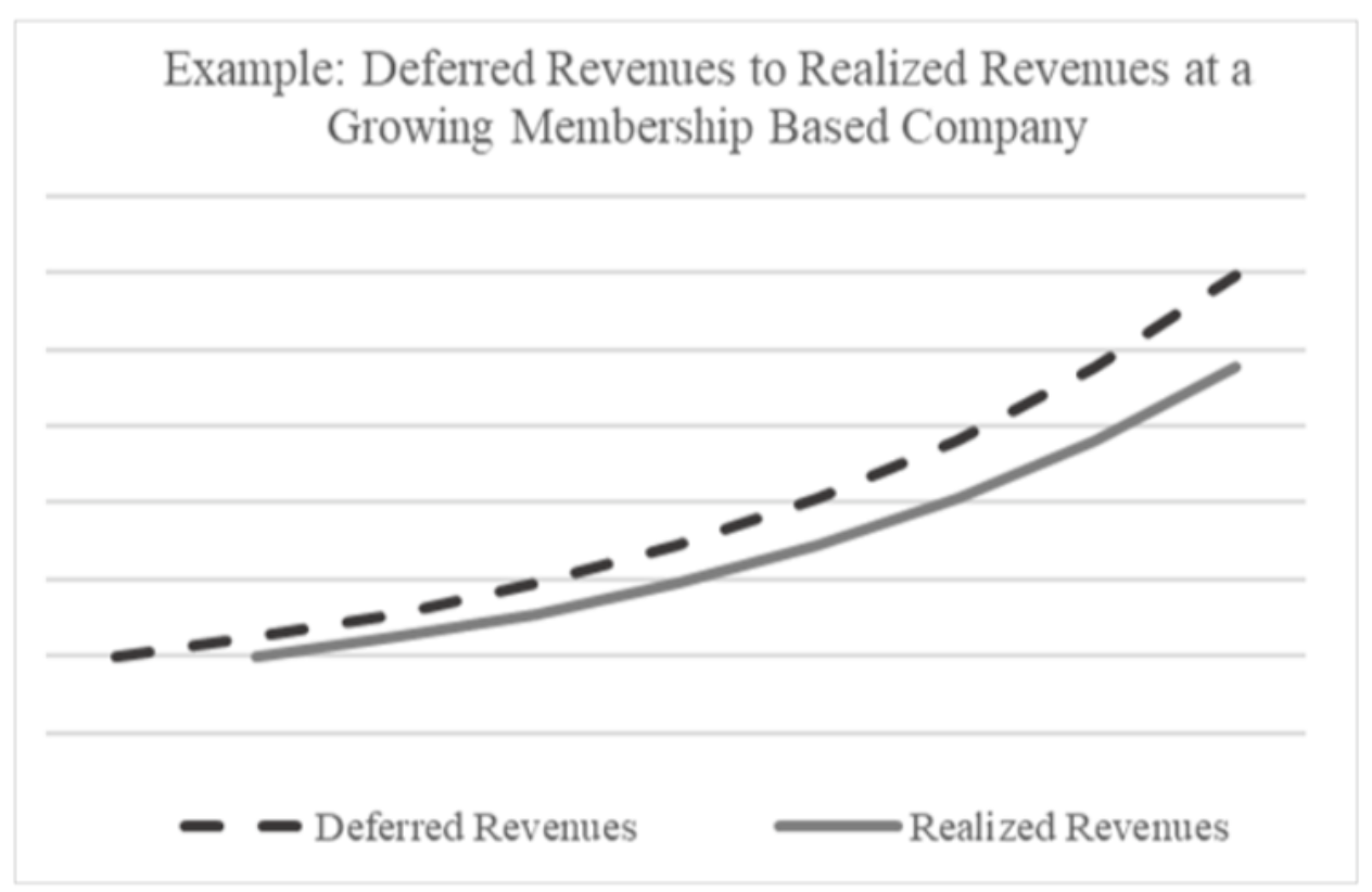 下图是一个示例,表明我们期望看到管理层的说法是否属实。由于订户为将来要交付的服务支付更多的前期费用,因此递延收入曲线始终领先于已实现收入曲线。