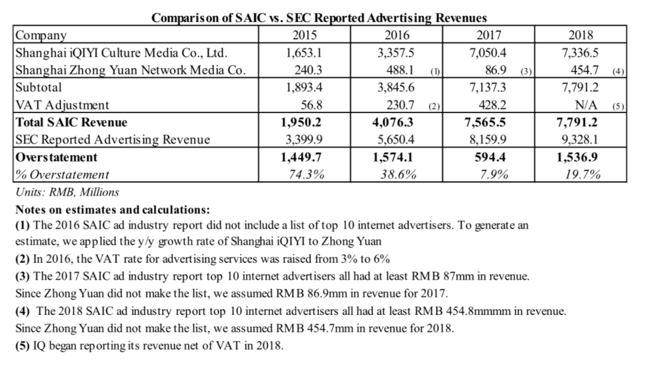 上海市政府基于上海工商总局报告的广告收入,发布了广告公司的排名报告。根据2015-2018年的报告我们得出结论,爱奇艺SEC文件披露的2015年至2018年间累计广告收入多报了人民币51.55亿元。因为我们在没有可用数据的情况下使用了最有利于爱奇艺的估计方式,所以我们认为实际的虚报远远大于我们的估计。