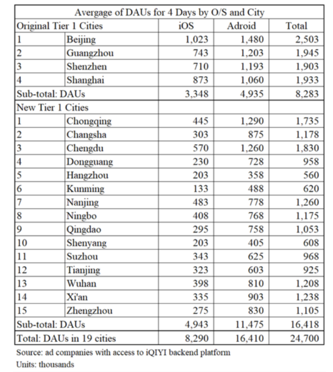 广告代理商可以访问中国19个“一级”城市的爱奇艺后端DAU数据。爱奇艺在2019年1月和2020年1月发布了有关在线电影行业状况的报告,其中提供了用户地理分布的细分情况。爱奇艺的报告表明,2018年,爱奇艺的用户中有36%在中国19个一级城市。2019年报告仅披露了中国五级城市从2018年至2019年的增长率。将这些增长率应用于2018年分布,我们能够计算出19个1级城市占2019年爱奇艺总用户的35.6%。