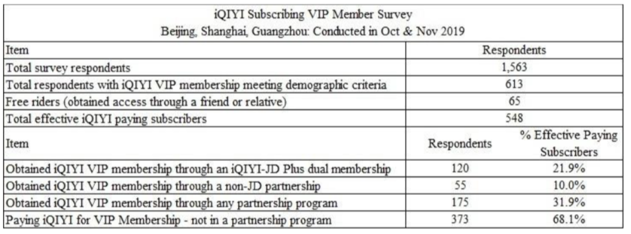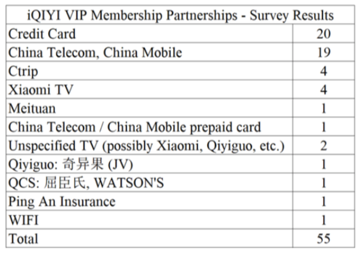 爱奇艺的管理层尚未提供有关双重成员的数量,通过这些伙伴关系带来的成员总数的百分比或这些伙伴关系中爱奇艺的实际收入份额的数据。爱奇艺的IR代表告诉投资者,与京东的收入分配为50/50,但没有透露与其他合作伙伴的交易的经济性。爱奇艺的IR还否认了京东双重成员资格和其他每个合伙关系对收入/ ARPU的影响,认为它们“可忽略”和“不重要”。