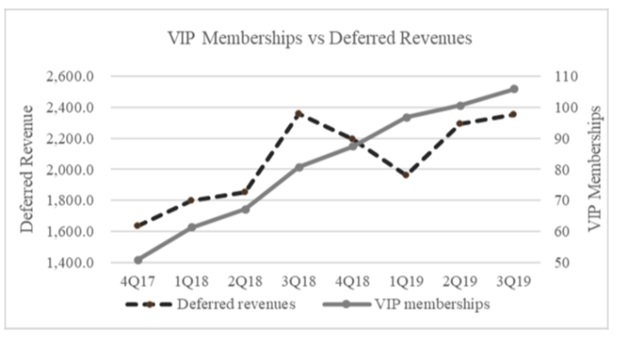 由于爱奇艺的管理层声称其增加了1610万净付费用户,并且平均订阅期已从18年第三季度到19年第一季度从大约6个月增加到了8个月,我们预计随着预付款的累积,递延收入将显着增长。但是,我们发现相反的情况。下图对比了爱奇艺报告的付费订户与其报告的递延收入余额: