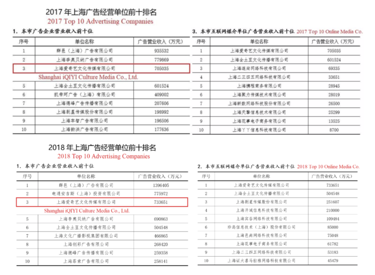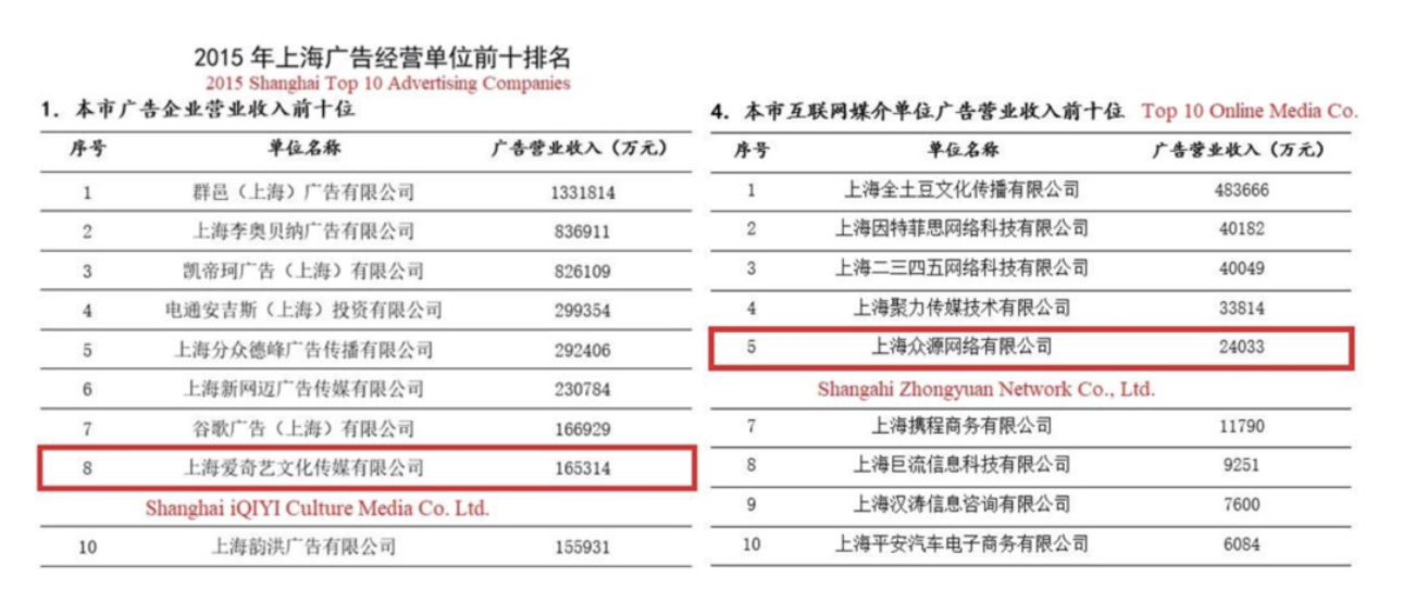 爱奇艺的主要广告公司是上海爱奇艺文化传媒有限公司,简称“上海爱奇艺”。爱奇艺的二级广告公司上海中原网络媒体有限公司(“中原”),负责爱奇艺独立的直播广告业务。2015年,根据上海工商总局披露的信息,这家公司的广告收入位列在线媒体公司前十。