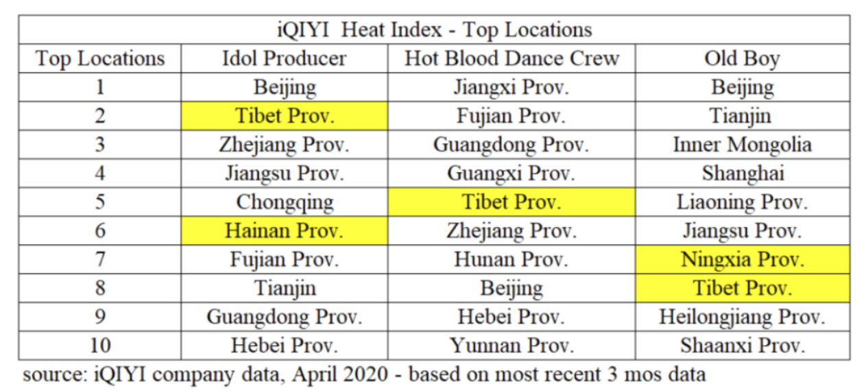 但是,最近爱奇艺受欢迎的节目(包括“老男孩”,“偶像练习生”和“热血街舞团”)前十名中人口很少的地区出现了,如西藏,海南,宁夏或内蒙古。