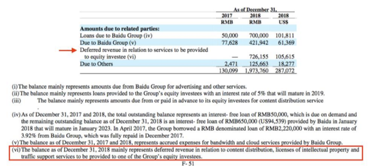 爱奇艺只是夸大了其投资,声称以“要交付的内容”的形式提供了额外的非现金出资,爱奇艺价值约为7.775亿元人民币(1.1021亿美元)。截至2018年12月31日,该非现金出资在爱奇艺的账簿上记为“与提供给关联方的服务相关的递延收入”人民币7.262亿元。