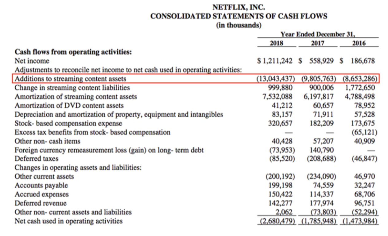 内容许可和生产成本是迄今为止两家公司最大的支出。但是,爱奇艺和NFLX使用的OCF计算完全不同。Netflix将“对流媒体内容资产的所有增加”都记为经营活动的现金流出,而爱奇艺将对获得许可的版权材料的收购归类为投资活动的现金流出。最初的购买不仅对爱奇艺的OCF没有负面影响,而且随后的摊销对OCF也具有积极的影响。爱奇艺的会计方法显然旨在掩盖其业务正在浪费现金这一事实。相比之下,持续盈利的Netflix则是OCF负值。Netflix的现金流量表如下所示。它将用于内容的所有现金归类为“经营活动中使用的净现金”。这会带来负面的OCF: