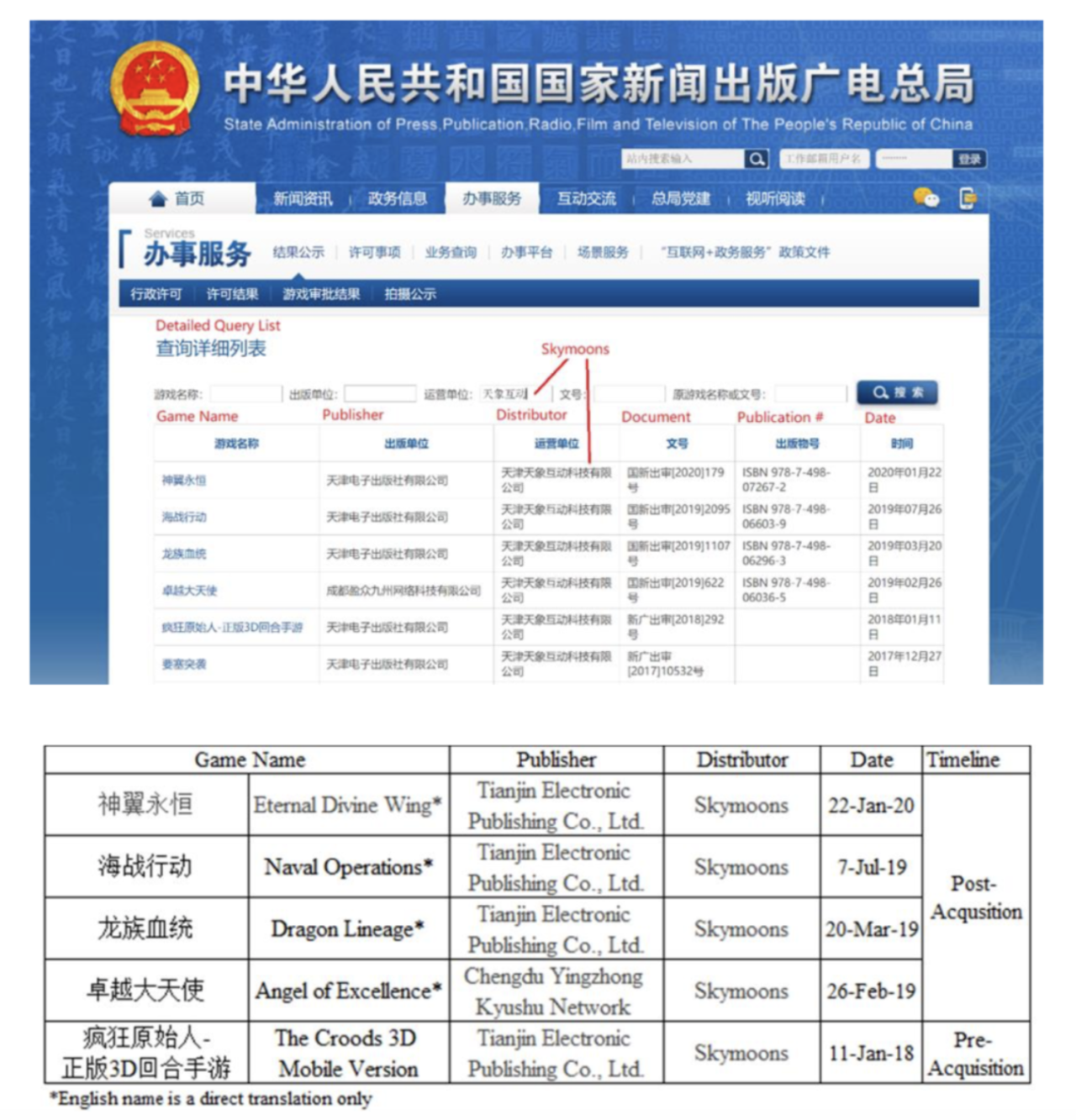 我们对中国版权记录的调查显示,自2018年7月收购以来,天象互动尚未注册任何新的出版物版权。相反,我们只找到了4个游戏的发行权,其名称均由其他游戏公司许可: