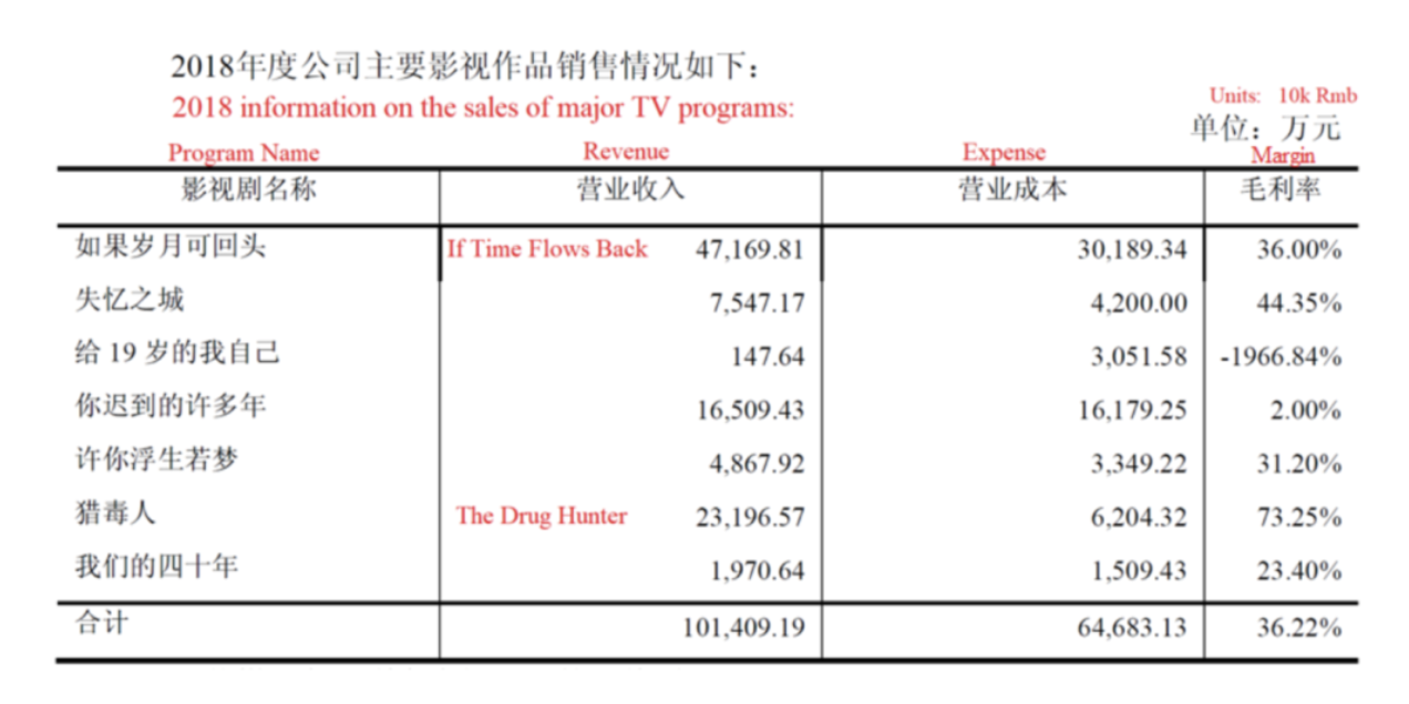 当代明诚的报告称,《如果岁月可以回头》的总收入为人民币47,169万元,而《毒猎人》的总收入为人民币23,196万元。这两个项目对于当代明诚的影视媒体业务在2018年的盈利能力至关重要。领先的收入来源,实现了36.00%的毛利率。《毒猎人》是第六大收入来源,毛利率为73.25%:
