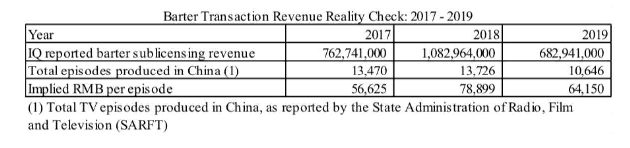 爱奇艺会计欺诈行为中最令人震惊的一个例子就是易货交易收入的膨胀。易货分包许可收入是由爱奇艺内部对其交易内容价值的估计决定的。换句话说,爱奇艺的管理层可以有效地为这些交易分配任何他们想要的价值,从而提供了一个容易夸大收入的机会。根据一名参与内容获取的前爱奇艺员工提供的每个非独家剧集的最高估计价值,爱奇艺将需要为所有制作的电视剧总集的3.9倍和3.2倍交换许可证。中国生产公司将分别在2018年和2019年合法实现其报告的易货收入。