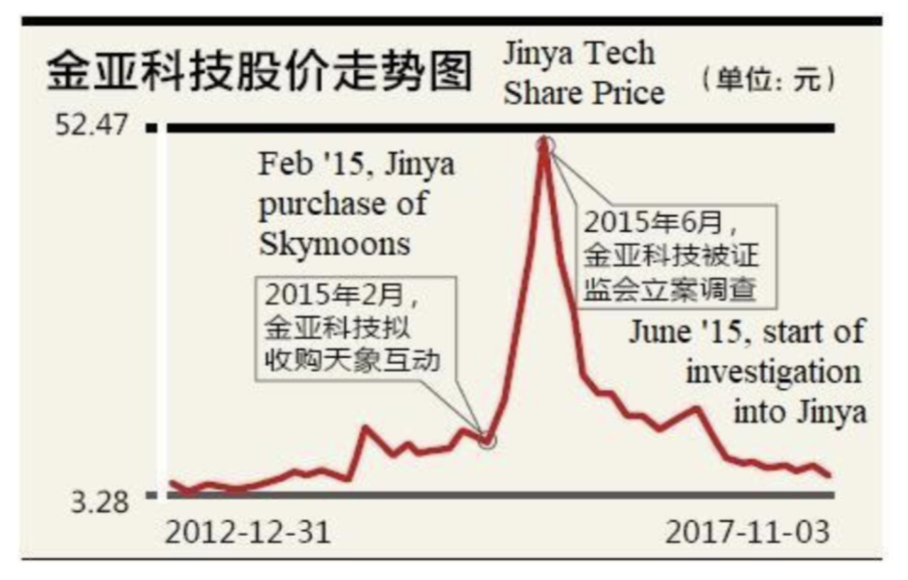 2015年6月4日至5日,金亚科技收到了中国证券监督管理委员会(“中国证监会”)的两份“调查通知”。金亚科技被禁止从事促成交易的必要资产重组,并于2015年7月中国证监会的调查后来发现,金亚科技在2013年遭受重大损失后开始欺诈。金亚隐藏了多年的持续亏损,这可能会导致其退市。