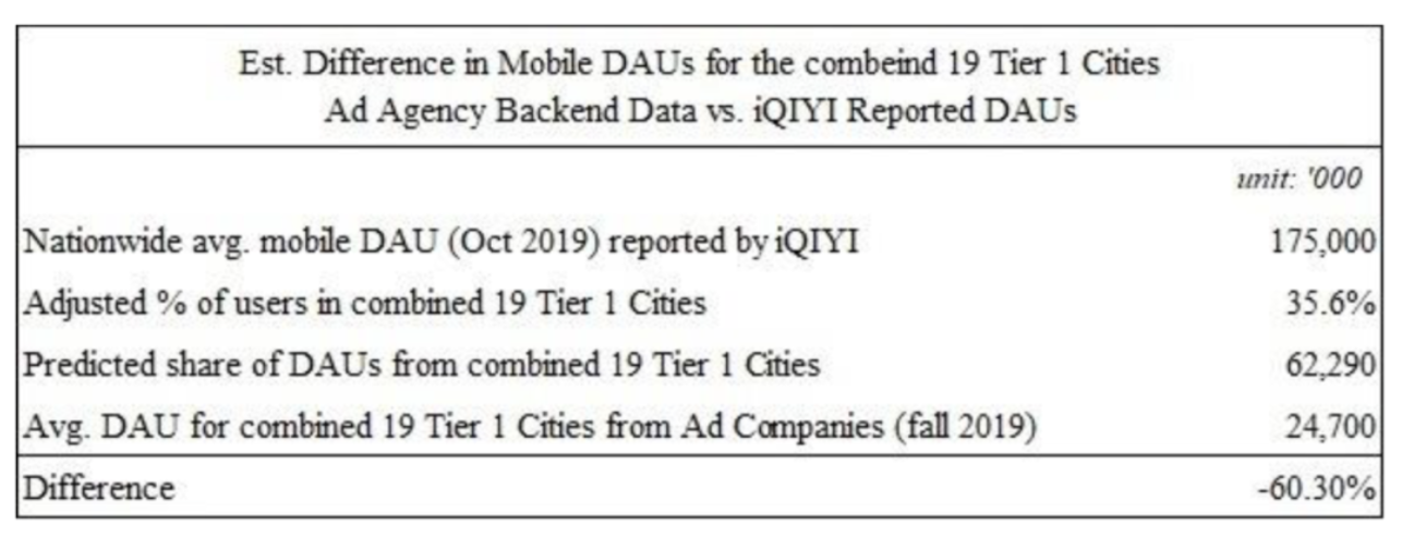 两家中国广告公司向我们提供了爱奇艺后端系统的数据,这些数据表明爱奇艺从2019年9月起的实际移动DAU比2019年10月爱奇艺声称的平均1.75亿个移动DAU降低了60.3%。