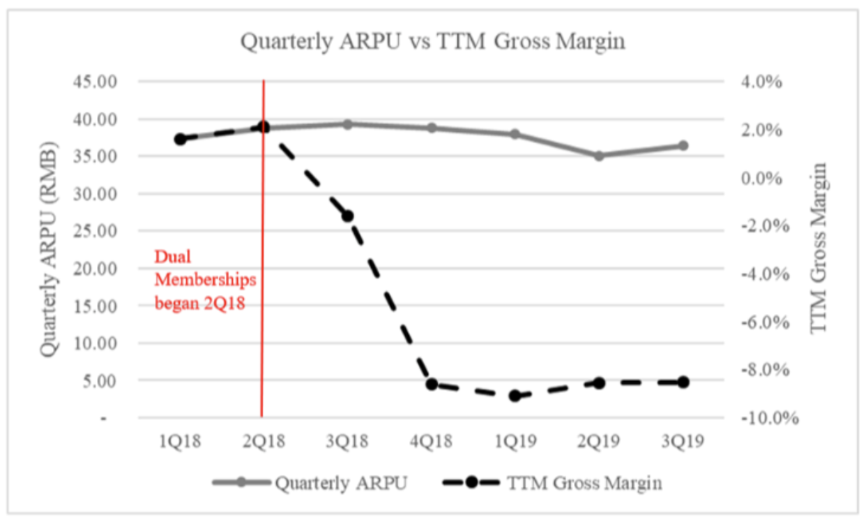 当我们将爱奇艺的ARPU与首次公开募股以来的毛利率进行比较时,爱奇艺使用这些双重会员计划的程度就非常清楚了。由于爱奇艺总体上考虑了这些双重成员身份,因此其ARPU保持相对稳定,而毛利率却暴跌: