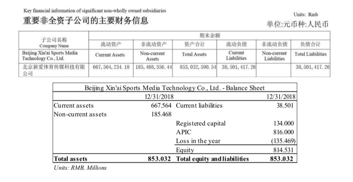 如果爱奇艺实际承诺出资7.96亿元人民币,那么新爱的流动资产应增加约7.757亿元人民币,并记为APIC,但没有(注意上表中的APIC余额为8.16亿元人民币,而爱奇艺与以下资产负债表上的APIC相匹配);或应显示为“其他应收款”(下页表格显示武汉明诚的“其他应收款”余额仅为2.11亿元人民币)。