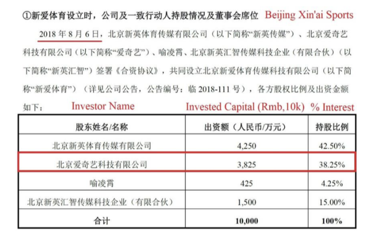 爱奇艺表示,它收购了北京新爱体育媒体技术有限公司,由武汉明诚拥有多数股权的合资企业,中国公开上市公司的32%股权。爱奇艺称其32%的股权来自7.96亿元人民币(1157.73万美元)投资。但是,当我们比较武汉明诚披露的股权和投资时,我们发现爱奇艺的股权仅记录为现金投资3,825万元人民币(560万美元),没有发现其他应缴款项的记录。