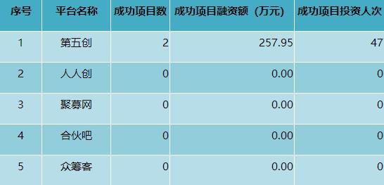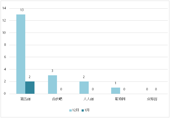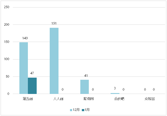 5家股权型众筹平台在1月共成功2个项目,成功项目总融资额约257.95万元,总投资人次为47人。成功项目数、成功项目融资额及投资人数与12月相比都有所下降。