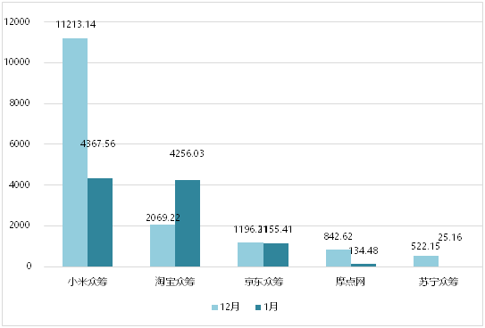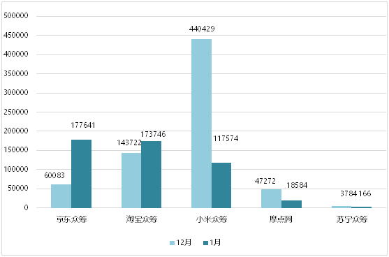 5家权益型众筹平台在2020年1月共成功481个项目,与去年12月相比上升了77个,环比下降19.06%。成功项目数最多的平台为京东众筹,为241个,环比上升达67.36%。淘宝众筹和摩点网次之,分别为131和92个。与12月相比,淘宝众筹与摩点网的成功项目数均有所增加;小米众筹和苏宁众筹项目数有所下降,环比下降幅度分别为31%与88%。